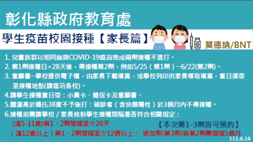 請家長評估意願後,於6/20(一)前上google表單填報https://forms.gle/652eV3pQ2kn7JRzc8,逾期未填報視為自行帶至醫療院所接種疫苗。